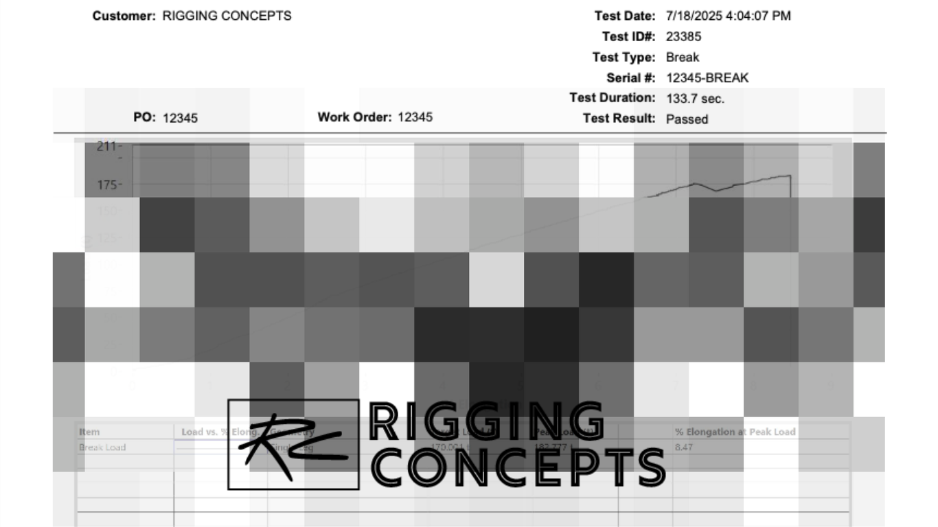 Representative examples of controlled failure testing ➡️ For actual Break Certificates please contact us. Break test results are provided for engineering reference only and do not represent rated working loads. Safe working limits must be determined by the user based on application, system design, and applicable standards.